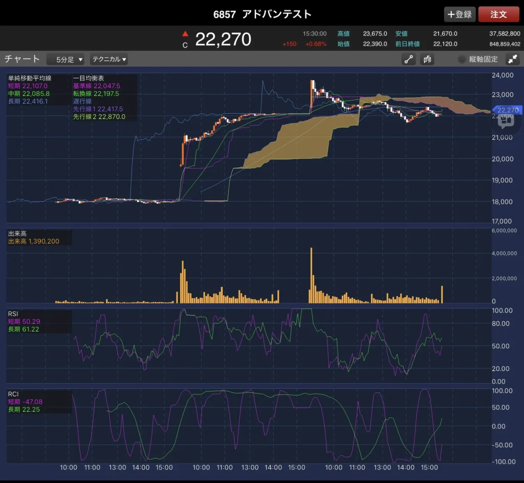 昨日ストップ高だったアドバンテストが今日も上げて、でもマイ転して、と難しい相場でした。