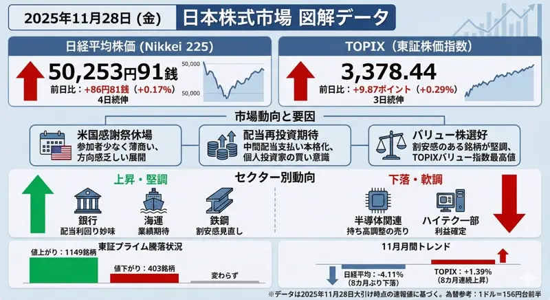 2025年11月28日の東京株式市場は、日経平均株価が4営業日続伸し、終値で前日比86円81銭高の5万0253円91銭を記録するという、象徴的な一日となった1。この日の市場動向は、単なる株価の変動以上に、日本市場が直面している構造的な変化と、投資家の心理的な強気姿勢を浮き彫りにするものであった。米国市場が感謝祭(サンクスギビング・デー)の祝日により休場であったため、通常であれば市場の牽引役となる海外機関投資家のフローが極端に減少する「空白の一日」となるはずであった3。しかし、蓋を開けてみれば、薄商いの中にあっても売り圧力は限定的であり、むしろ心理的な節目である5万円を割り込んだ局面では、国内投資家を中心とした強力な押し目買いが観測されたのである2