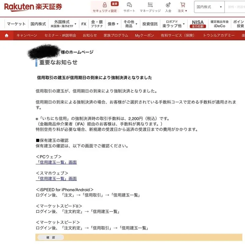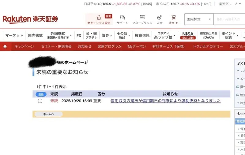 楽天証券のサイトに「強制決済」の重要なお知らせが届く