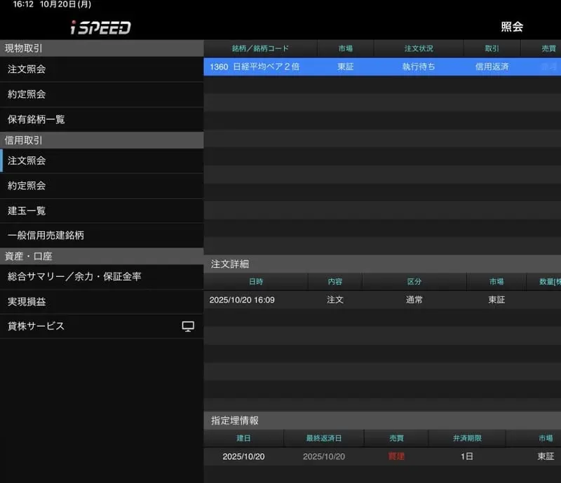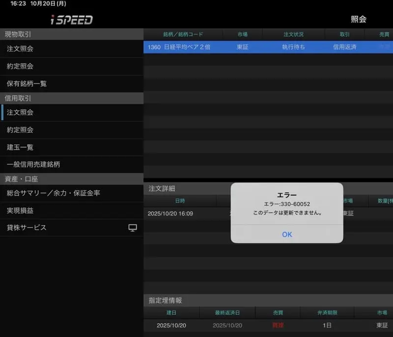 iSPEEDアプリ(iPad版)を開いてみると、注文照会にはちゃんと強制決済の注文が入っていました。